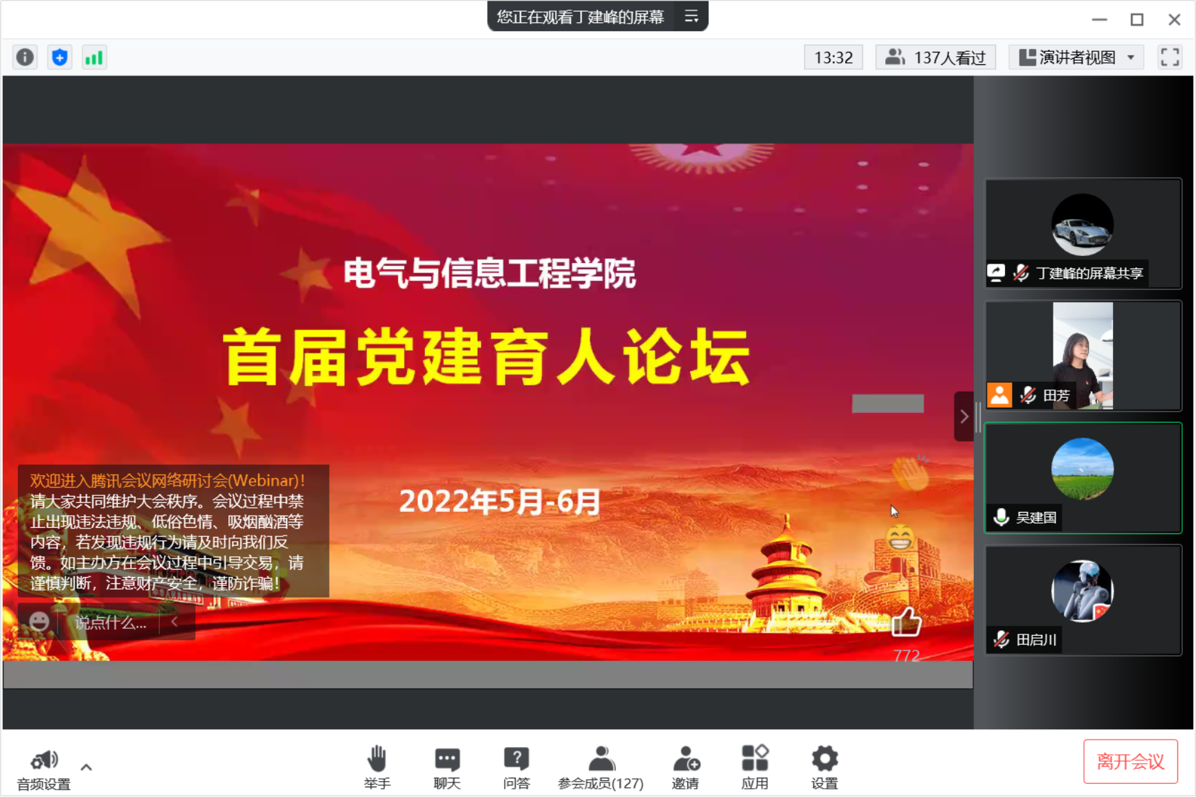 5月26日,电信欧博娱乐城 首届党建育人论坛开幕暨首场报告开讲。欧博娱乐城 领导班子成员、党委委员、师生共计200多人相聚线上,共同参加论坛活动,活动由党委副书记田芳主持。