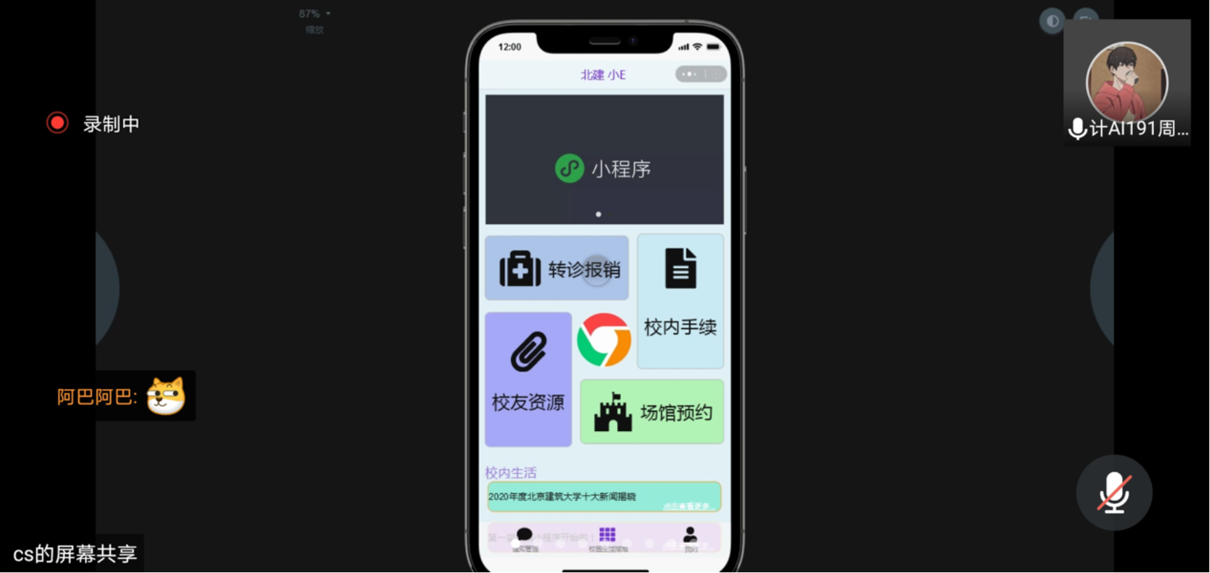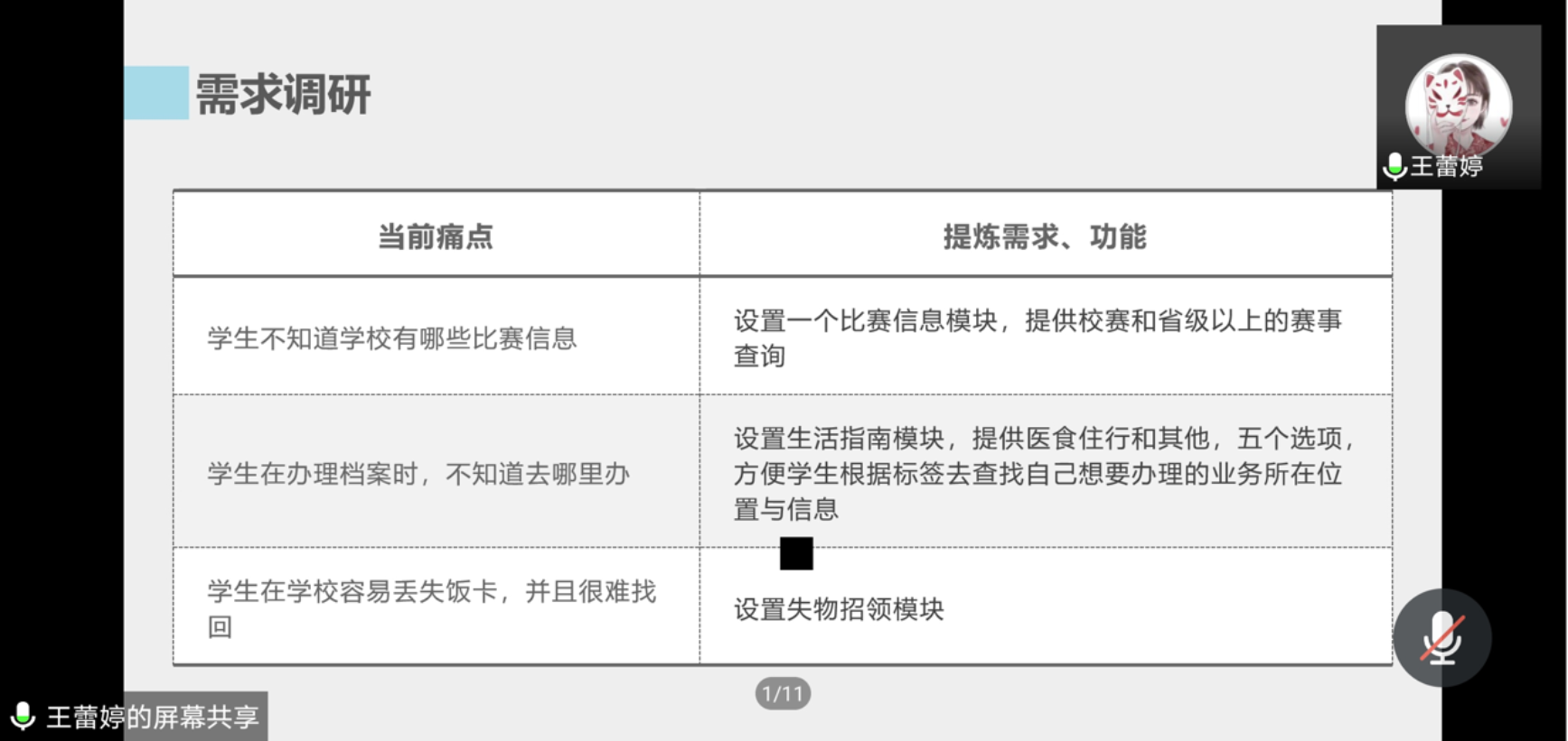 微信小程序应用开发大赛的第三阶段,各个小组通过之前阶段的线上学习,设计出产品原型并参加答辩。本次线上答辩交流会检验了同学们一个星期以来的学习进度与学习成果,并且给同学们创造了一个互相学习、互相交流的平台,便于同学们更好地进行交流与设计,为接下来的小程序应用开发做好准备。