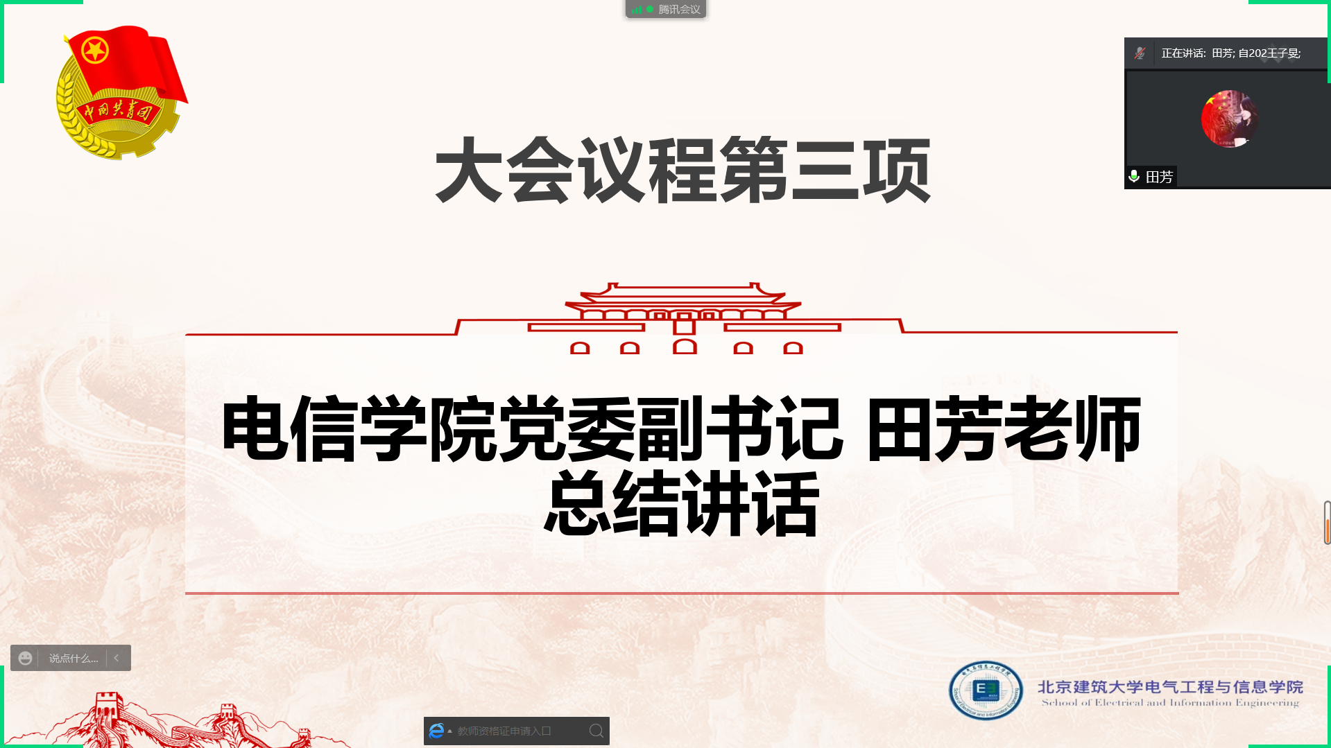 会议第三项,党委副书记田芳老师进行总结讲话。在此,田芳老师对各位优秀候选人进行肯定,希望各位优秀候选人不断加强自身修养,发现自身问题,并及时进行改进;除此之外田书记也呼吁大家可以在思想、学业、竞赛上多方面发展,真正成为德智体美劳的当代大学生。