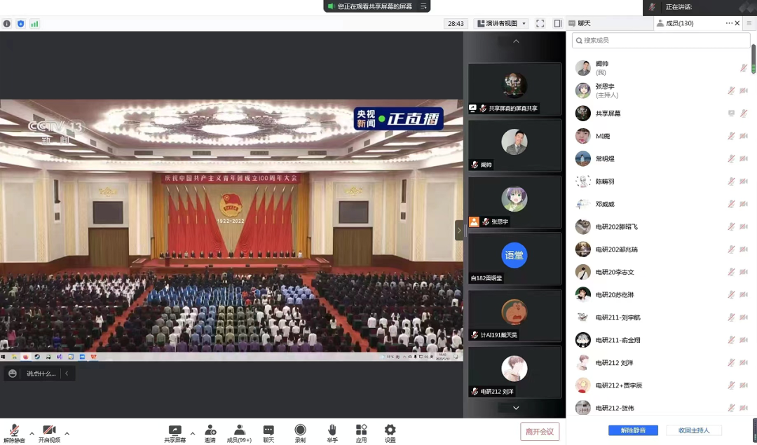 电信欧博娱乐城 组织团员青年线上收看大会直播,并在会后第一时间组织集体学习,欧博娱乐城 本研各年级团员代表130余人参加线上学习会。