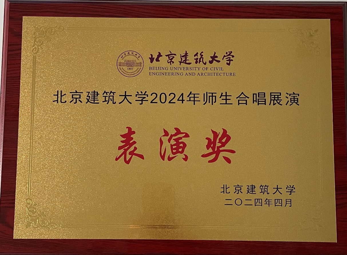 我院50余名师生经过多次排练,在舞台上以饱满的精神状态、高昂的士气演唱了《映山红》和《祖国不会忘记》两首曲目,凭借扎实的唱功、稳健的台风和优秀的指挥,获得了北京建筑大学2024年师生合唱展演表演奖。