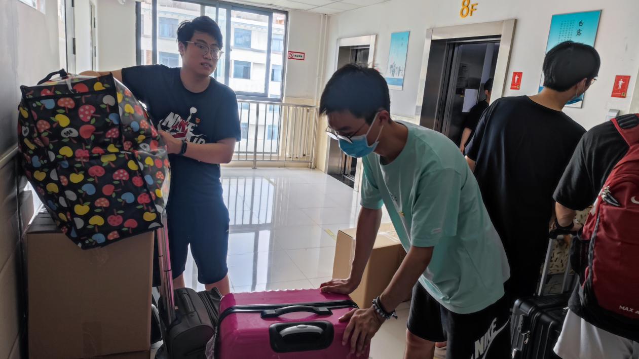 学生党员们不辞辛苦,穿梭在宿舍楼与校园之中,丝毫不在意高悬的烈日,不顾自己已被汗水浸湿的衣裳与满是水汽的口罩,搬运着一箱箱沉甸甸的行李,但是他们没有一人叫苦叫累,全心全意地竭力为毕业生们服务。
