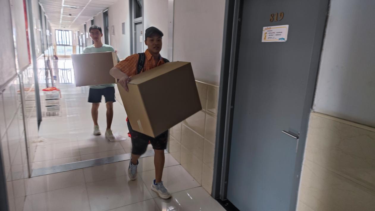 在寝室里打包的过程中,学生党员们与毕业生们进行视频连线,确认所需要打包的物品。学生党员们在寝室里上下奔走,爬高俯身,耐心地反复确认每一处细节,精确地定位每一件物品,争取做到一件不漏,确保每一段珍贵的回忆都能回到毕业生的手中。