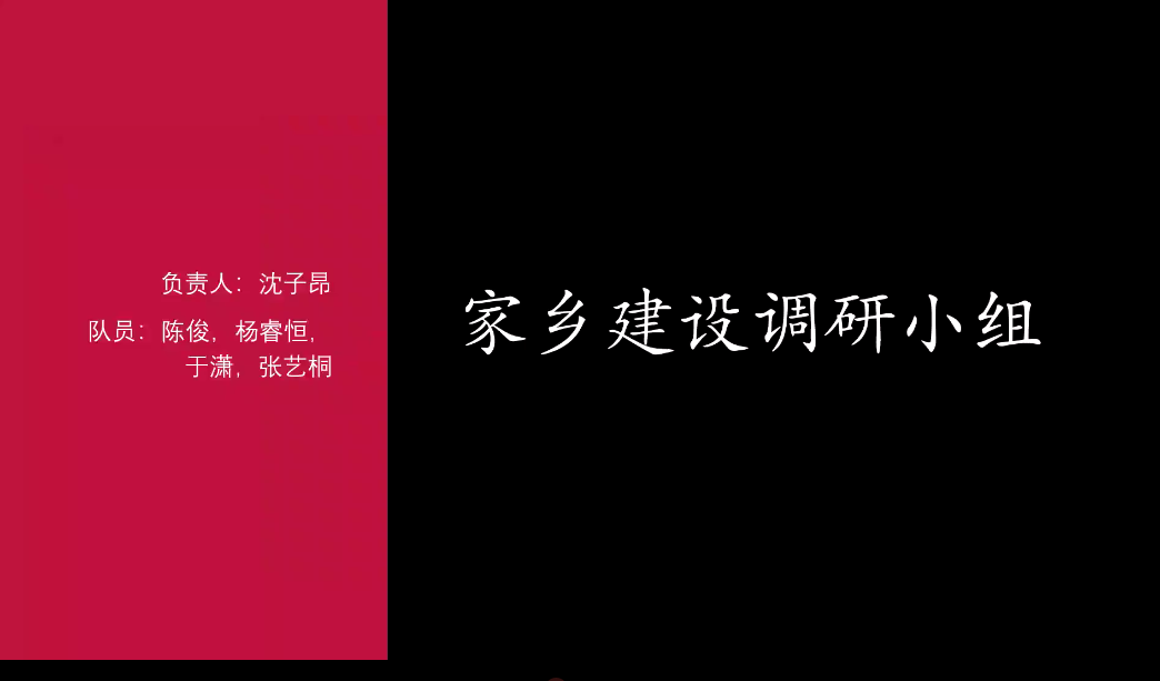沈子昂同学向大家介绍了“家乡建设调研”实践团——5名同学结合目当前我国处在建设社会主义现代化国家的关机时期,通过线上收集、问卷调查、问题反馈等多种形式,切实调查家乡建设全面变化。 团队主要围绕家乡建筑设施的建设改变,以及建设投入使用的实用程度,征集附近民众对此的看法和满意度调查。