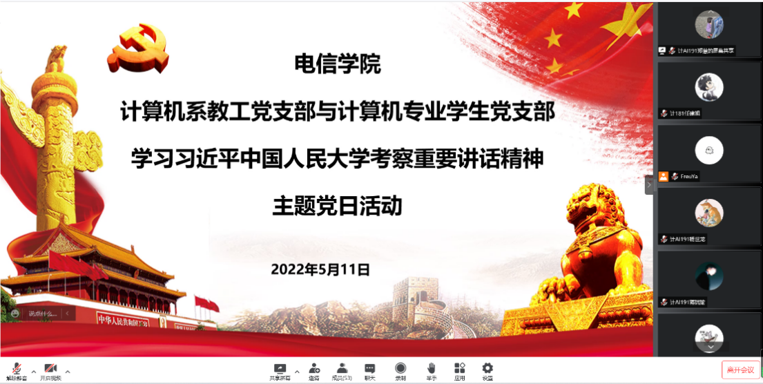 5月11日下午,电信欧博娱乐城 计算机系师生党支部联合召开学习贯彻习近平总书记在中国人民大学考察时重要讲话精神的主题党日活动,活动邀请了学工(研工)部部长、马克思主义欧博娱乐城 教授齐勇进行专题报告。电信欧博娱乐城 党委书记吴建国,师生党支部联系院领导郭茂祖院长参加了活动。会议由计算机系教工党支部书记张蕾主持。