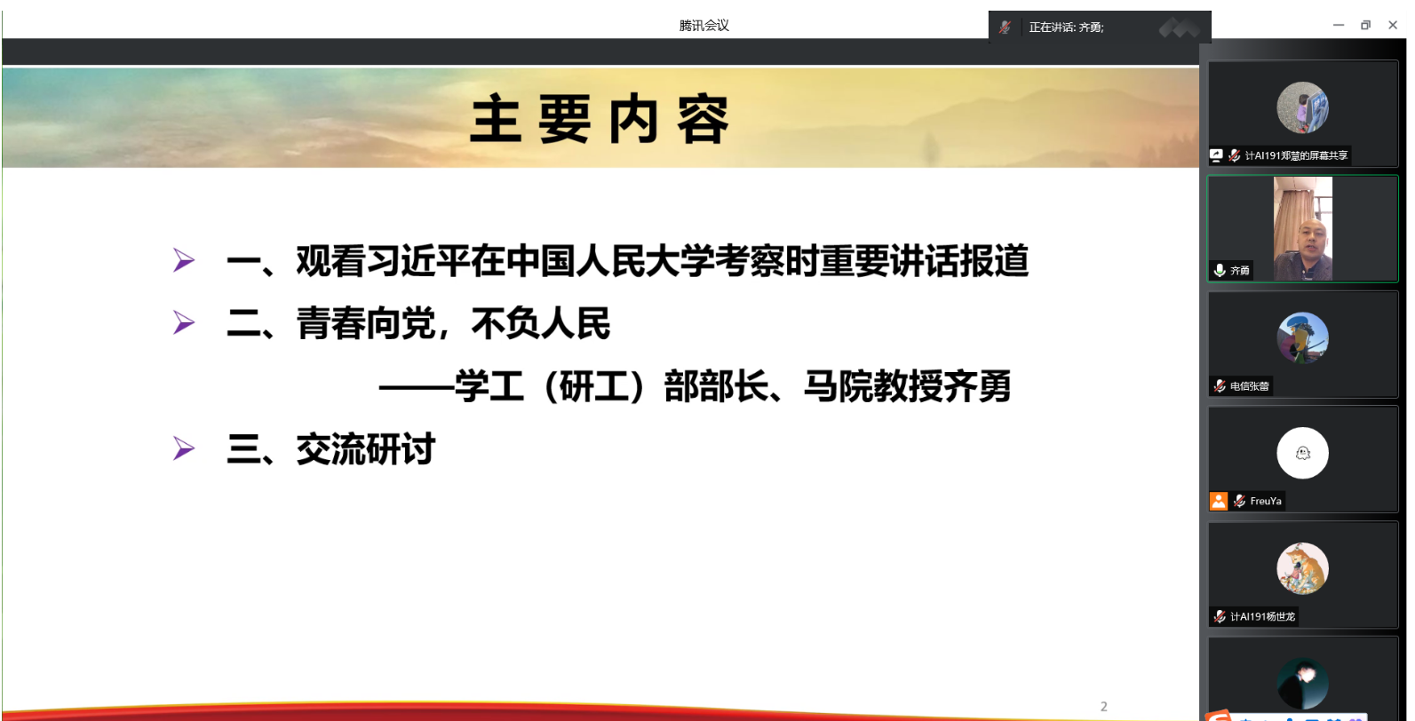 师生共同观看了习近平总书记在中国人民大学考察时的新闻报道。齐勇围绕习近平总书记的讲话,分别从“大学校”、“大命题”、“大先生”、“大课程”和“大熔炉”五个方面为支部师生进行专题辅导。与会师生分享交流了学习体会,纷纷表示要始终不渝地坚持党的领导,提高自身能力,练就过硬本领,坚定理想信念,争做时代先锋。