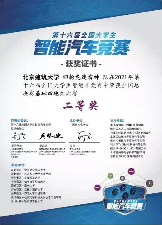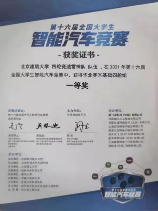 8月23日,由教育部高等学校自动化类专业教学指导委员会、清华大学主办的第十六届全国大学生智能车竞赛比赛圆满收官,本届大赛共有来自全国482所高校的2472支队伍报名参赛,经过8个分赛区的比赛选拔,来自211所全国知名高校的435支队伍最终进入全国总决赛。北京建筑大学电信欧博娱乐城 出征的两支队伍,由汪杰、谭志、胡道容指导,均发挥出色,力克北航、北邮、北交等各路高手,取得华北赛区一等奖,全国总决赛二等奖,创造学校历史最佳成绩。