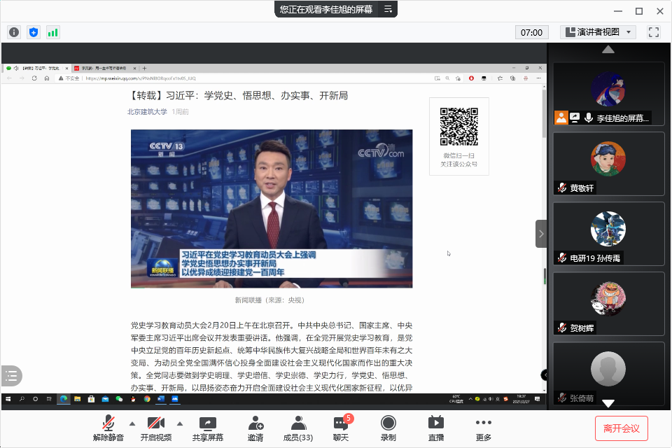 电研各年级的班会上,同学们就各自科研情况进行了学术交流,并共同学习了习近平总书记党史学习教育动员大会讲话精神。胸怀千秋伟业,恰是百年风华。今年是中国共产党成立100周年,党史学习教育正当其时,十分必要。习近平总书记在党史学习教育动员大会上的重要讲话,为我们开展好党史学习教育指明了方向,提供了根本遵循。