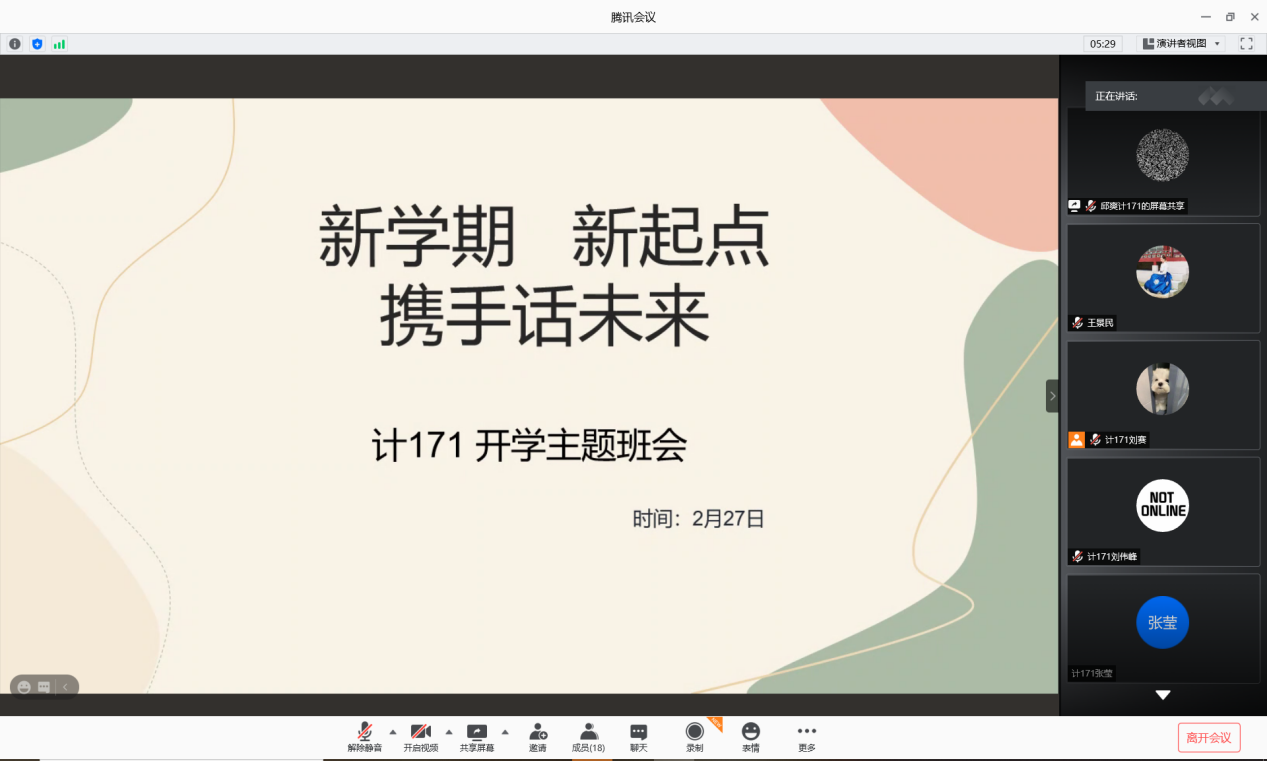 计171班班会以“新学期 新起点 携手话未来”为主题。会上,学委总结班级学风情况、团支书进行学党史动员,并组织学习了李英姿教授先进事迹,班长介绍返校的相关安排。面临大四年级最后一个学期,同学们要做出各类选择,此次班会还以就业为主题,开展就业经验分享。三名同学分别分享了开发、测试和产品经理三个岗位实习和面试感受。崔彦然同学就简历、面试等就业经验进行了分享。会上,班级导师刘亚姝总结了上学期班级在科研和生活中的情况,鼓励同学们再接再厉,艰苦奋斗,取得更好的成绩。学工部部长齐勇就三点展开分享。第一,全面对照自己的初心,梳理自己的大学生涯,制定好最后阶段的目标;第二,全面做好毕业准备,为大学生活划好句号;第三,下一个100年是智能时代的100年,大家的专业大有用武之地。在建党100周年之际以及冬奥会的大好机会,不断努力提升自我,为社会做更大的贡献。