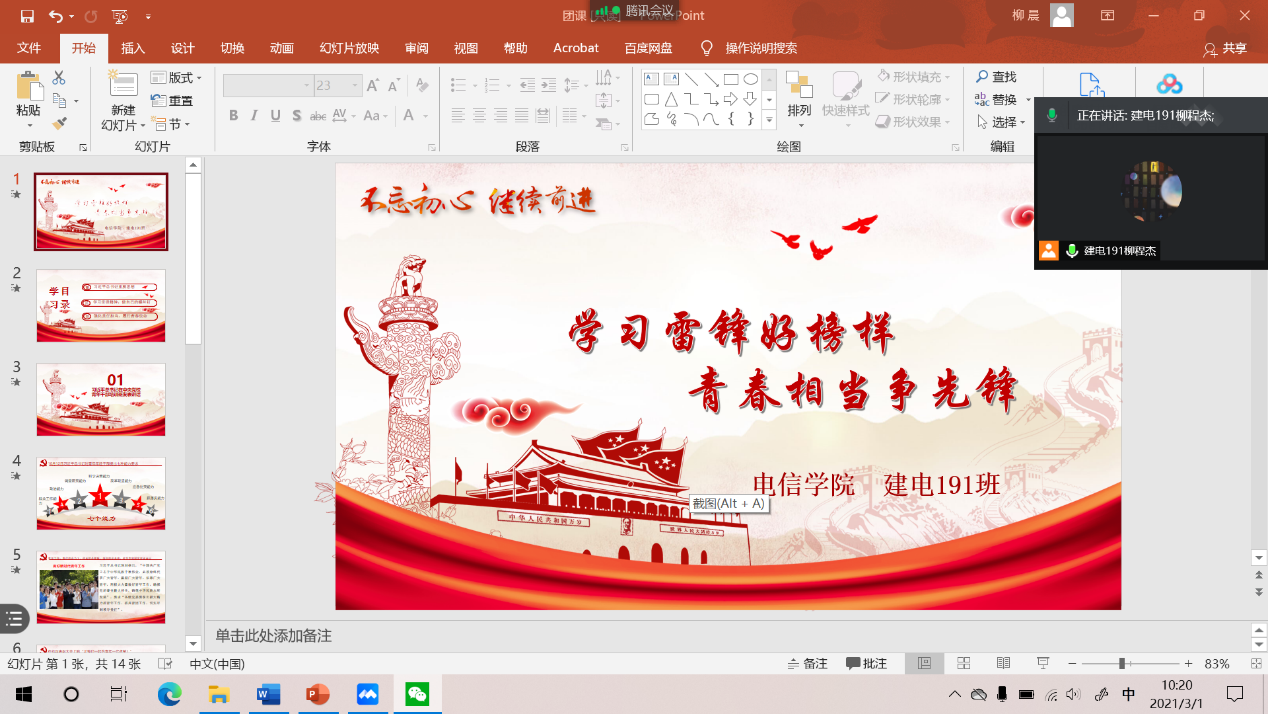 建电191班班会重点进行了雷锋精神的学习和传扬。团支书柳程杰同学为同学们介绍雷锋的先进事迹。旨在鼓励大家学习雷锋精神,通过开展学雷锋、献爱心、讲奉献、志愿者服务思想教育,引导青年发扬传统美德,热心帮助他人,用行动回报社会,提升大家思想道德素质。