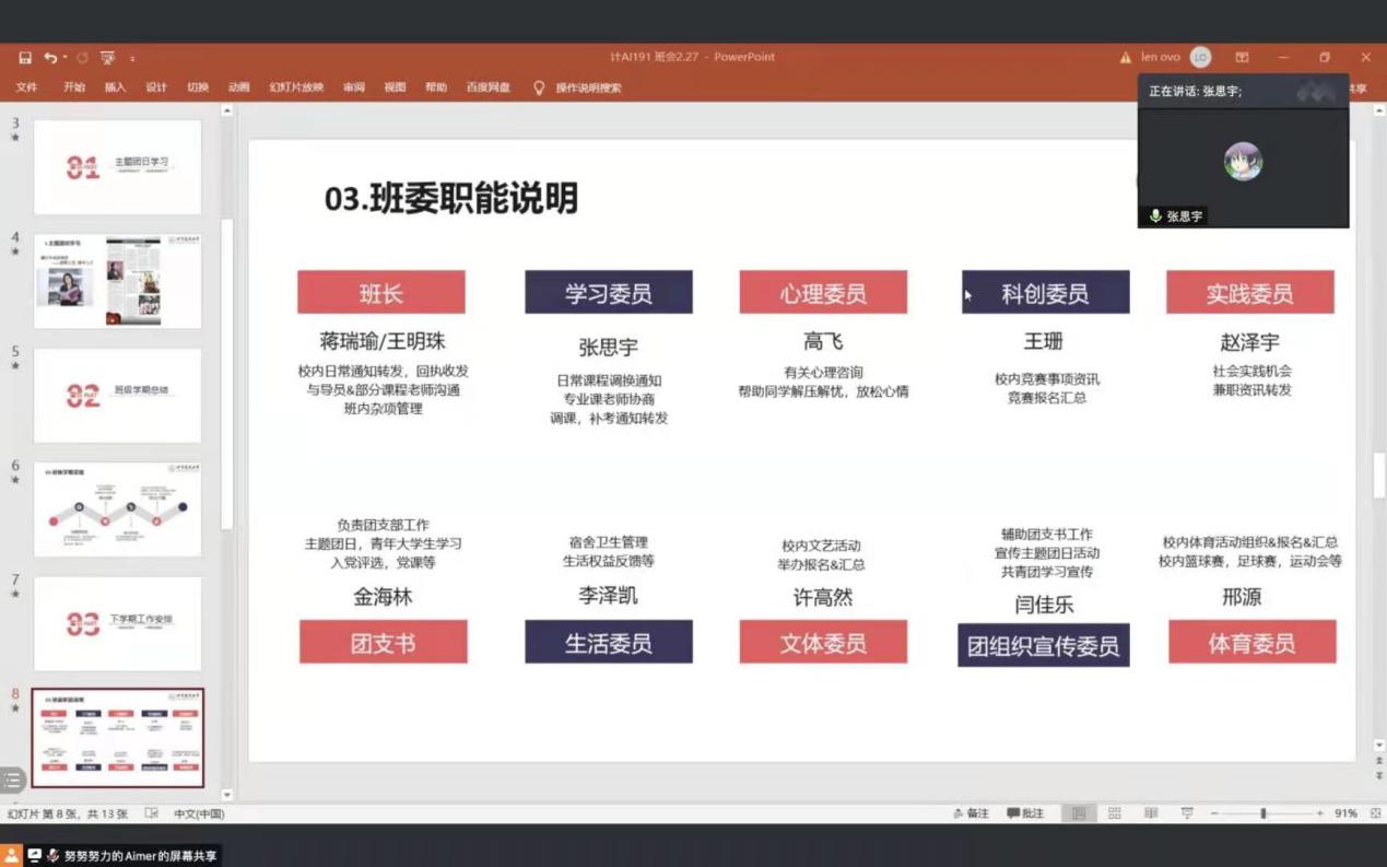 计AI191班会以“新学期、新希望、新起点、新挑战”“学习李英姿教授先进事迹”“疫情防控、你我同行”三方面为主题。就理想信念、爱国主义、疫情防控、学风建设等内容展开广泛深入的讨论和学习。在班级总结板块,主要就上学期学习成绩和班级学风建设进行总结,并对下学期班级建设工作开展部署。明确班委分工职责细化,完善奖励、惩罚机制,促进班级同学认识。新学期板块,介绍返校的相关安排,强调返校的注意事项。班会最后,辅导员胡老师对同学们学习生活中遇到的问题进行引导,班主任隋老师针对本专业学习方向;如何去学习进行总结,并鼓励同学们积极参加科技竞赛。希望同学们共同努力,保持班级优良学风,共建优良班集体。