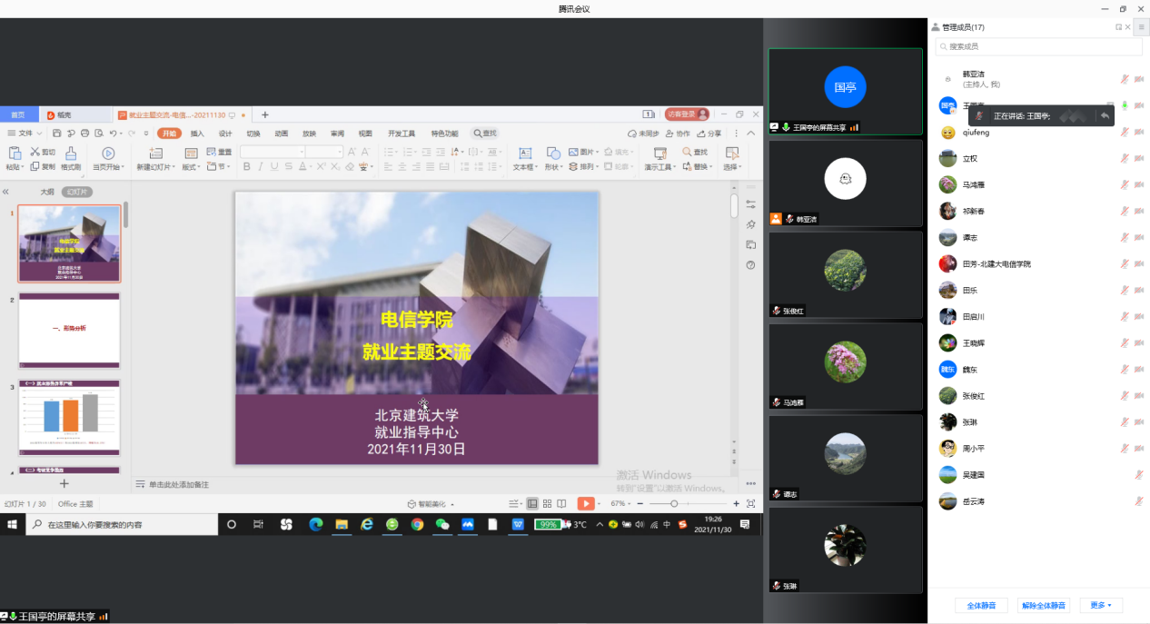 首先,就业辅导员韩亚洁围绕2022届本科毕业年级就业意向、重点关注群体情况、学风情况、就业工作目标等内容进行深入分析探讨。接着,就业指导中心王国亭分析了今年的就业、考研的形势,对学生“缓就业、慢就业”的现象进行了深入剖析,还解读了最新的就业政策,在就业指导过程中需要注意的问题等等。