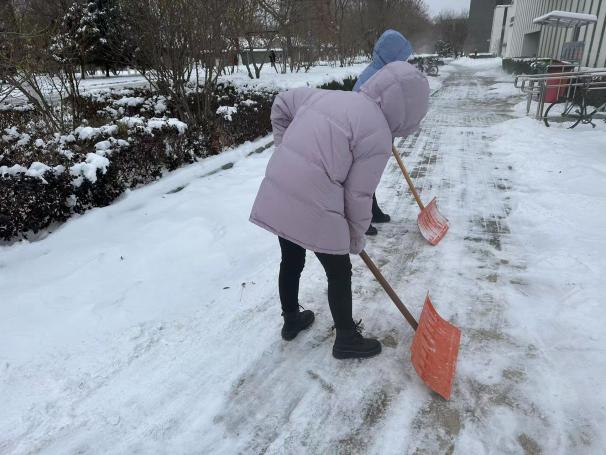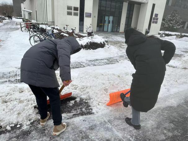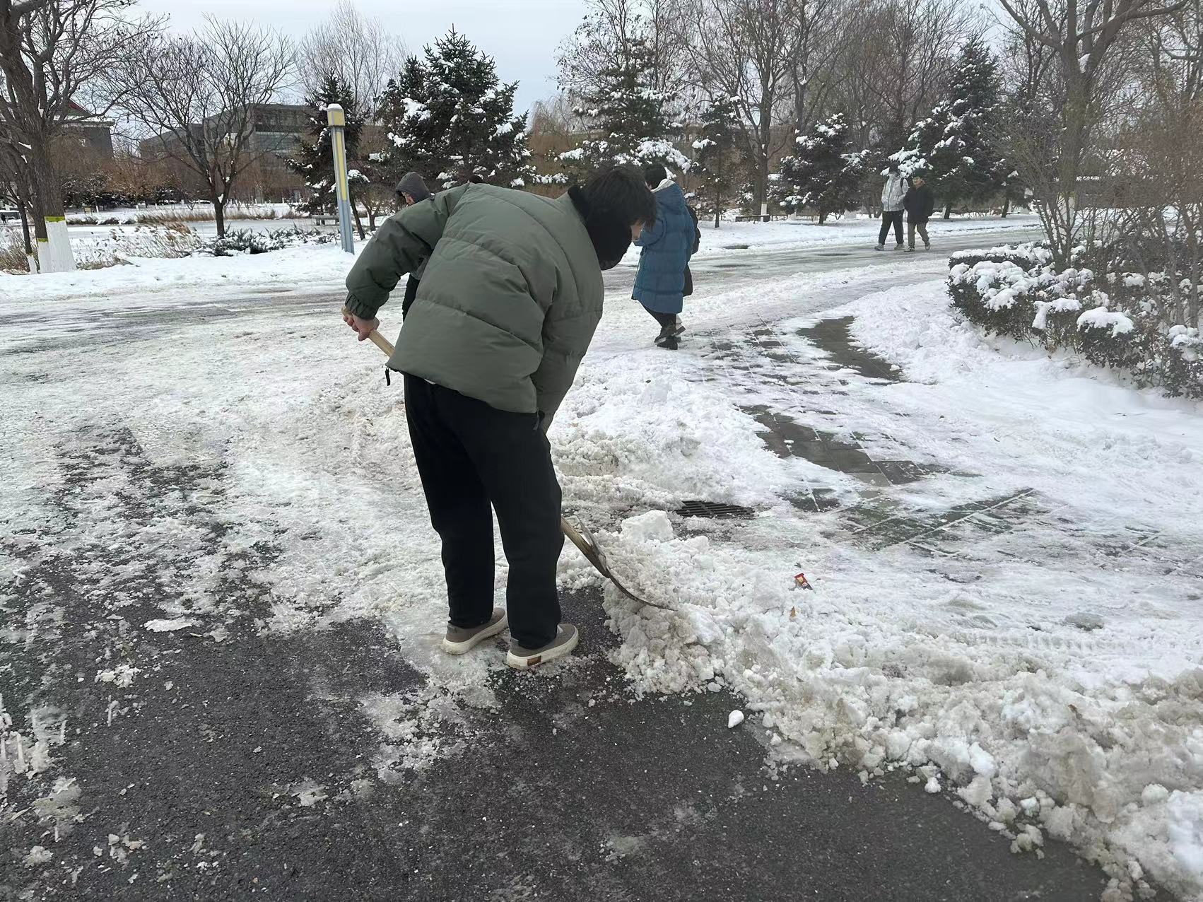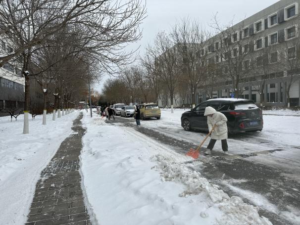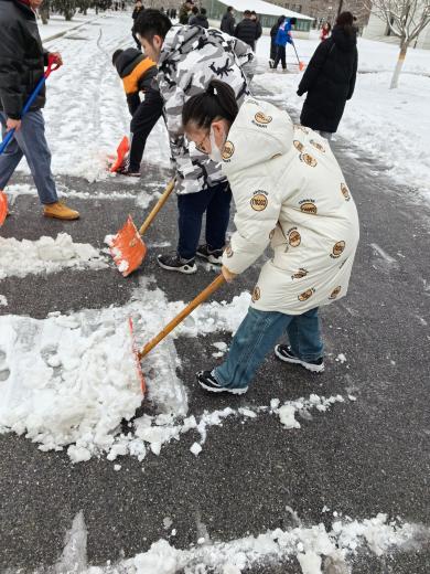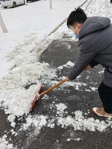 在寒冷的天气中,大家分片区奋力而有序地清理路面积雪,为师生的初心安全提供了便捷。