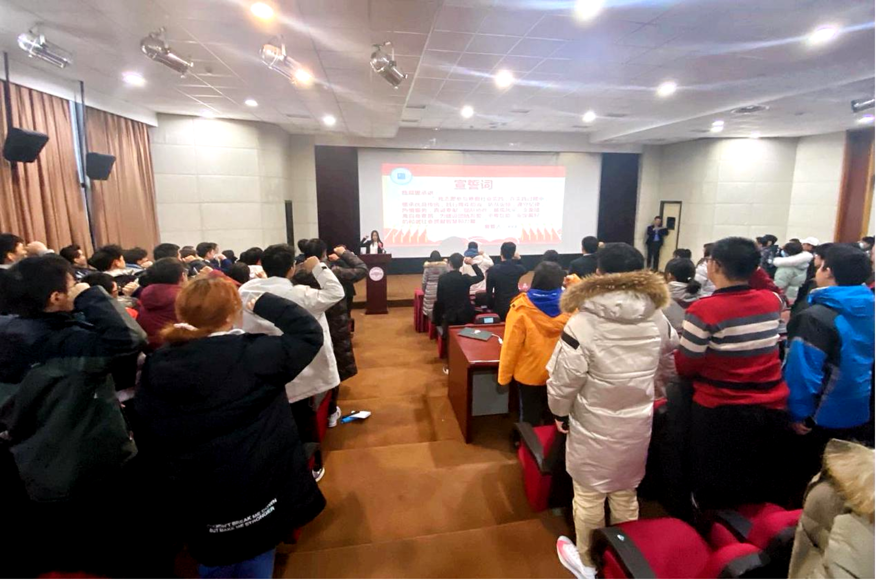 全体起立,举起右拳,学生团委副书记霍腾宇带领与会同学进行寒假社会实践出征宣誓,继承优良传统,践行青年担当,发扬志愿精神,为建设团结友爱、平等互助、安定美好的和谐社会贡献力量。