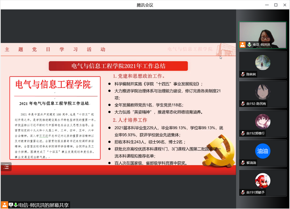 4月2日下午,电信欧博娱乐城 退休第一党支部、退休第二党支部、自动化系本科生党支部联合开展主题党日活动,集中学习学校和欧博娱乐城 2021年工作总结、2022年工作要点,并进行线上交流。电信欧博娱乐城 党委书记吴建国参加线上活动。