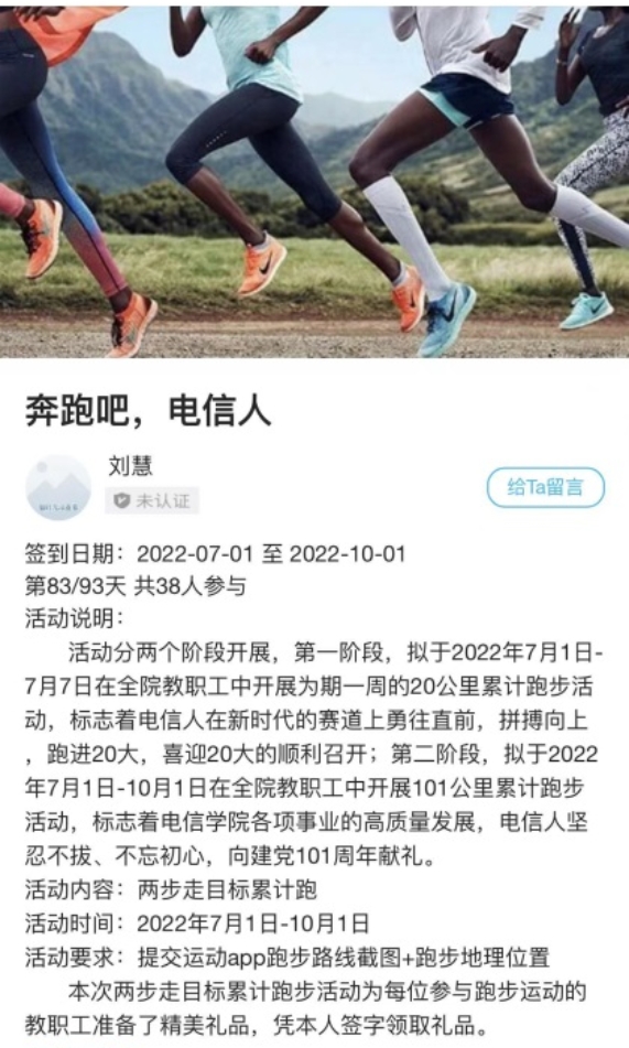 通过线上完成运动打卡,进一步促使教职工养成运动习惯,展现了电信人昂扬向上的精神面貌。通过活动,激发广大教师奋发有为,以健康的身心状态更好地投入到学校欧博娱乐城 各项发展事业中,喜迎党的二十大胜利召开!